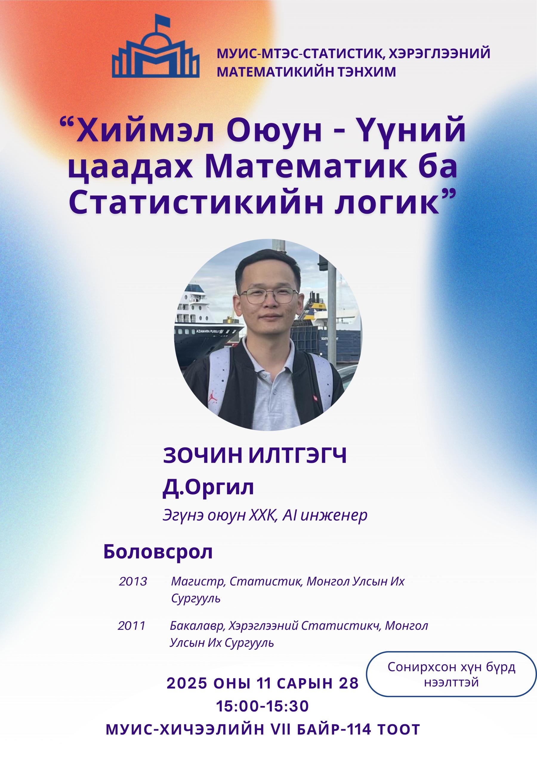 Зочин илтгэгч: [М.Од, МОСТ Финтек ХХК, Дата анализын газрын захирал Д.Оргил, Эгүнэ оюун ХХК, AI инженер]