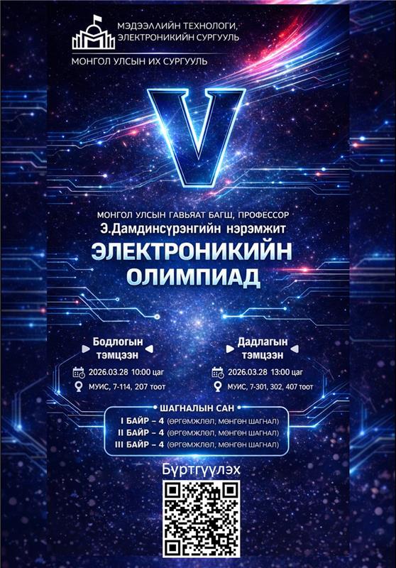 Монгол Улсын Гавьяат багш, профессор Э.Дамдинсүрэнгийн нэрэмжит МУИС-ийн электроникийн V олимпиад 2026 оны 03-р сарын 28-ны өдөр зохион байгуулагдах гэж байна.